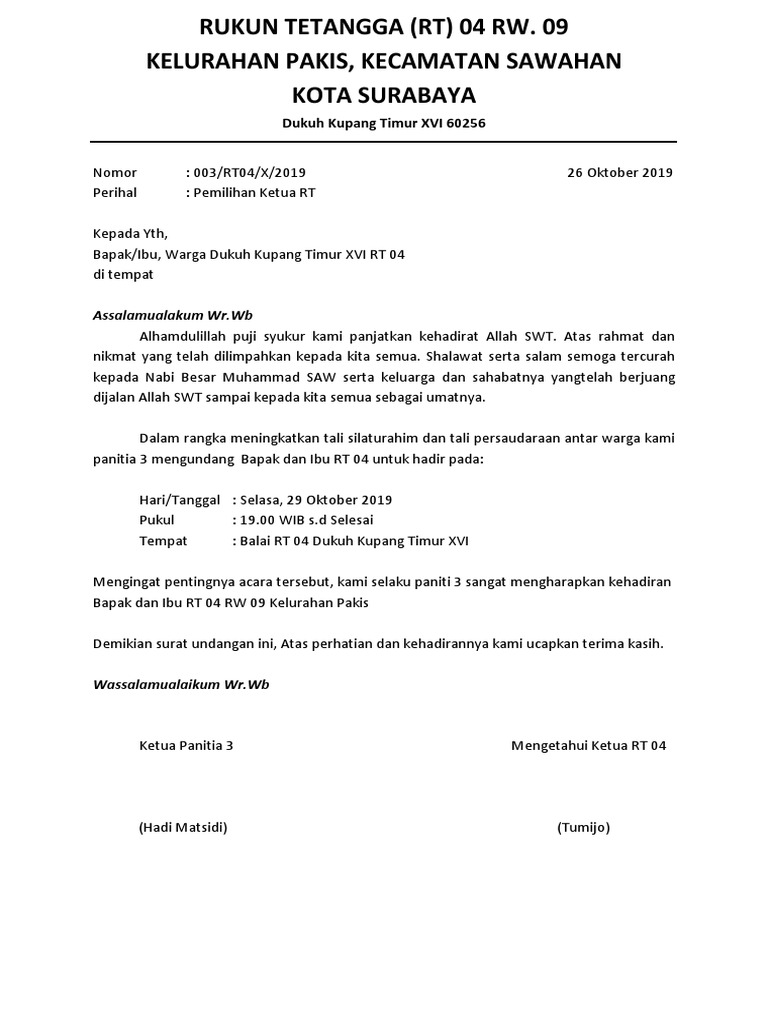 Pada artikel contoh surat berikut ini kami akan memberikan contoh surat undangan arisan rtyapss dilingkungan tertentu seperti dilingkungan tempat tinggal mimin. Batam 14 juni 2019. Rapat sendiri memiliki arti suatu kegiatan yang berisi diskusi guna membahas hal hal seperti merencanakan dan mengevaluasi sebuah kegiatan pada suatu tempat. Surat undangan dapat berupa surat resmi maupun tidak resmi. 02rt o1vi2019 hal. Kumpulan contoh surat undangan pemilihan rt yang benar 2019.