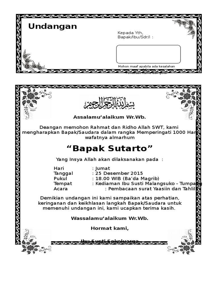 Undangan kali ini saya desain ukuran hvs atau f4. 7 contoh surat undangan tahlil tahlilan 3 hari 40 hari 100 hari 1000 hari 1 tahun terlengkap. Kegiatan tahlilan merupakan acara selamatan yang dilakukan oleh sebagian umat muslim di indonesia yang tidak lain bertujuan untuk mengenang dan mendoakan orang yang telah meninggalwafat. Contoh surat undangan tahlil 40 100 1000 hari hauldoc. Agenda tahlilan biasa diadakan berkala serta mempunyai rentang waktu dari hari pertama sampai hari ketujuh kematian kemudian dilanjutkan pada hari ke 40 hari ke 100 sampai menginjak waktu selagi setahun sampai tiga tahun. Contoh undangan tahlil file microsoft word.