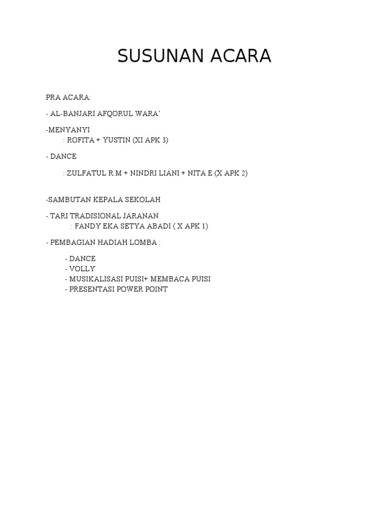 Contoh susunan acara perpisahan sekolah. Meski sudah sudah teknologi yang super canggih surat tetap diperlukan untuk berbagai kepentingan. Untuk pelajaran seni budaya biasanya ujian prakteknya akan diadakan pensi pentas seni untuk seluruh kelas 12. Contoh laporan wawan rembug wawan ginem wawanca. Contoh susunan acara dalam berbagai kegiatan biasanya selalu saja ada cara pembukaan peresmian atau sekedar sambutan sambutan yang terangkum dalam sebuah susunan acara. Contoh naskah mcpembawa acara pensi pentas seni sekolah.