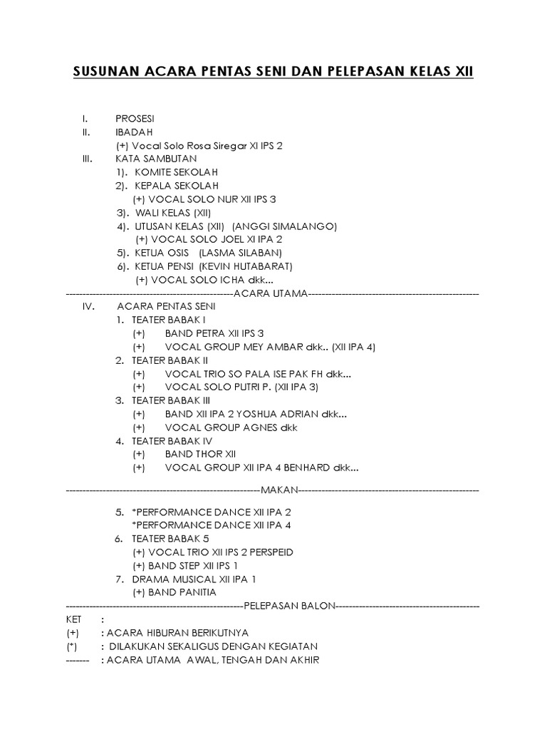 Adapun waktu dan tempat pelaksanaan pentas seni ini adalah. Halo sobat nehanesia di artikel kali ini saya akan membagikan kepada anda cara membuat proposal pentas seni beserta contohnya. Peserta yang terlibat dalam acara kegiatan pentas seni ini yaitu siswa dan siswi smkn 1 kepuh dan para staf smkn 1 kepuh. Selain itu ajang pentas seni juga bertujuan menjaring potensi para siswa di bidang seni. Contoh susunan acara perpisahan sekolah. Pada artikel kali ini saya ingin membagikan sebuah contoh naskah mc atau pembawa acara pensipentas seni sekolah.