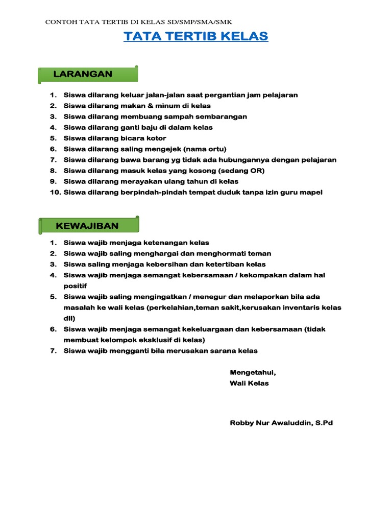 Contoh tata tertib kelas. Siswa harus sudah datang di sekolah selambat lambatnya 10 menit sebelum. Tertib masuk kelas 1. Untuk keterlambatan hadir kurang dari 10 menit masih di perbolehkan untuk masuk ke dalam kelas atau meminta izin terlebih dahulu pada guru piket. Dari pengertian di atas dapat dipahami bahwa tata tertib sekolah merupakan satu kesatuan yang tidak dapat dipisahkan satu dengan yang lain sebagai aturan yang berlaku di sekolah agar proses pendidikan dapat berlangsung dengan efektif dan efisien. Untuk itu berikut butir butir tata tertib kelas yang bisa anda gunakan untuk seluru jenjang pendidikan baik sd smp ataupun sma. Uptd tksd kecamatan bogorejo.