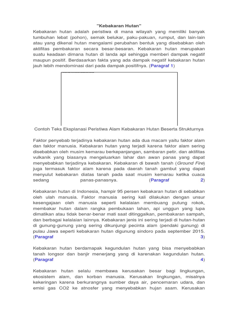 Contoh teks eksplanasi kebakaran hutan. Contoh teks eksplanasi kebakaran hutan adalah salah satu contoh teks eksplanasi yang akan kami bahas pada hari ini. Jika anda membaca sebuah bacaan mengenai peristiwa alam atau bahkan peristiwa sosial maka bacaan tersebut termasuk ke dalam beberapa contoh teks eksplanasi. Contoh teks eksplanasi merupakan suatu teks yang membahas tentang mengapa dan bagaimana peristiwa terjadi. 20 contoh teks eksplanasi beserta strukturnya. Setiap tahun pasti kita mendengar berita tentang terjadinya kebakaran hutan. Contoh explanation text tentang kebakaran hutan dalam bahasa inggris kebakaran hutan beberapa kali terjadi di indonesia.