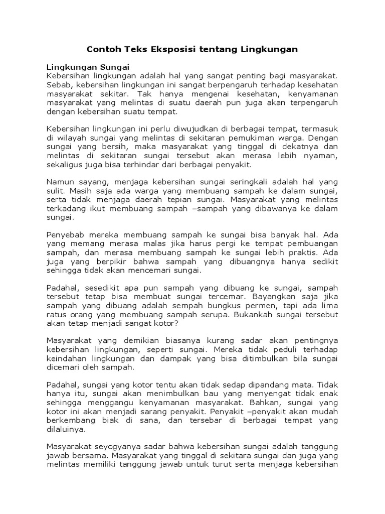 Contoh teks eksposisi tentang lingkungan. Teks eksposisi tentang lingkungan ini juga sama. Teks eksposisi jenis ini tentu saja berkaitan dengan lingkungan dan upaya upaya untuk mengatasi berbagai masalah lingkungan. Pengertian struktur teks eksposisi lengkap. Selain kedua contoh di atas contoh teks eksposisi selanjutnya adalah teks eksposisi tentang lingkungan. Contoh teks eksposisi teks eksposisi merupakan suatu tulisan yang berisi fakta atau informasi berbentuk pengembangan paragraf yang berupaya untuk menerangkan suatu keadaan tertentu sehingga orang yang membacanya mendapatkan pengetahuan dari apa yang diuraikan oleh penulis. Uraian tersebut berbentuk tulisan yang singkat padat dan jelas agar pembaca akan lebih mudah memahami maksud dari.