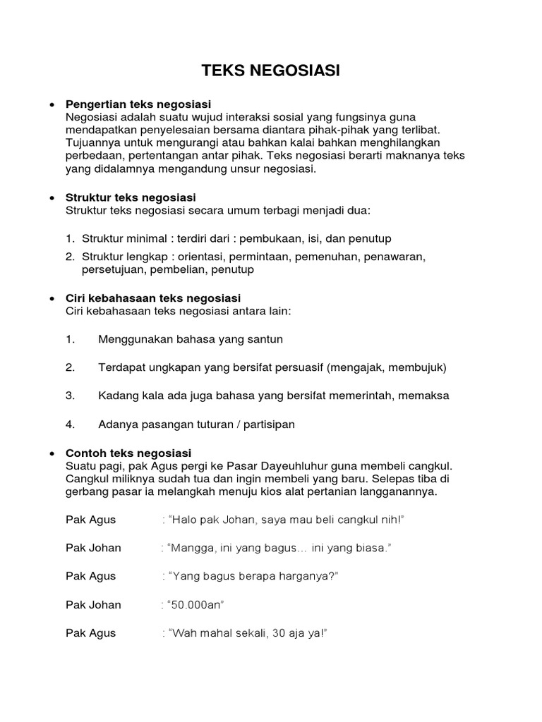 Contoh teks negosiasi jual beli dan strukturnya suatu hari ada seorang siswa sekolah menengah pertama pergi ke toko buku bekas. Struktur teks negosiasi tahukah anda jika didalam sebuah teks terdapat beberapa struktur yang menyusunnya bahkan yang membedakannya dengan teks yang lain. Kegiatan negosiasi tidak lepas dari kehidupan manusia sehari hari mulai dari negosiasi bisnis jual beli di sekolah lingkup masyarakat keluarga pengusaha dan pihak bank dan lainnya. Selain itu ada juga pembahasan tentang pengertian fungsi dan tujuan ciri ciri kaidah kebahasaan dan macam macam jenis teks negosiasi. 4 contoh teks negosiasi dan strukturnya mudah dibuat secara umum negosiasi memiliki arti sebagai interaksi sosial yang dilakukan oleh lebih dari dua pihak untuk mencapai kesepakatan yang saling menguntungkan. Bentuk tertulisnya dikenal sebagai teks negosiasi.