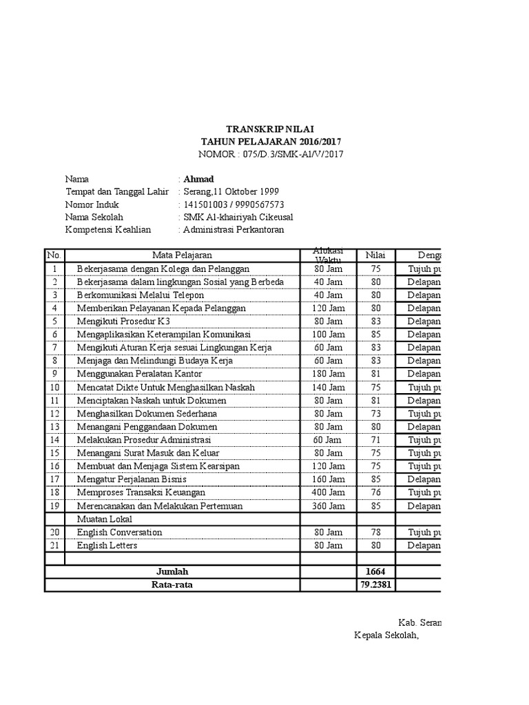 Contoh transkrip nilai sma. Rapor biasanya terdiri dari beberapa lembar kertas sedangkan transcript nilai biasanya hanya berbentuk satu lembar saja. File aplikasi transkrip nilai siswa sma smk dengan microsoft excel pada link di atas yang bisa anda download ini disimpan di cloud storage google drive untuk menjamin keamanan file dari virus atau malware file otomastis melewati proses scan anti virus oleh sistem google drive. Kalau yang ini contoh transkrip nilai dalam bahasa inggris. Rekam jejak yang komplit merupakan bukti bukti konkrit akan kesiapanmu untuk memasuki kuliah. Struktur kurikulum farmasi smk nusantara2015 2016. Jadi anda tidak perlu khawatir mendownload dan menggunakan file file ini di perangkat komputer anda.