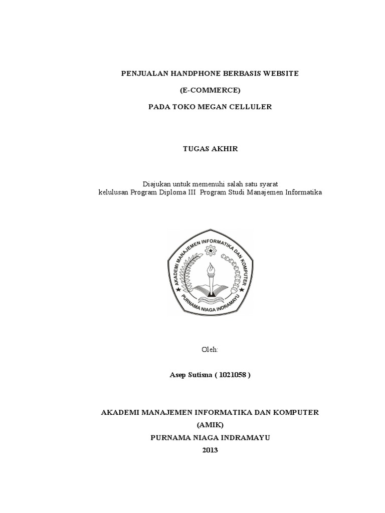 Aplikasi e commerce berbasis website sebagai media pemasaran on line pada distro fusion. Diajukan untuk memenuhi salah satu syarat kelulusan program diploma iii program studi manajemen informatika. Batik rahmawati surakarta diajukan untuk memenuhi persyaratan guna memperoleh kelulusan pada program diploma iii ilmu komputer fakultas matematika dan ilmu pengetahuan alam. Perusahaan juga akan memperoleh pelanggan yang semakin banyak karena pelanggan dapat melakukan pemesanan dengan lebih mudah tanpa harus datang ke tempat penjualan. E commerce pada toko megan celluler. Asep sutisna 1021058 akademi manajemen informatika dan komputer amik purnama niaga indramayu 2013 persetujuan dan pengesahan tugas akhir tugas akhir ini diajukan oleh.