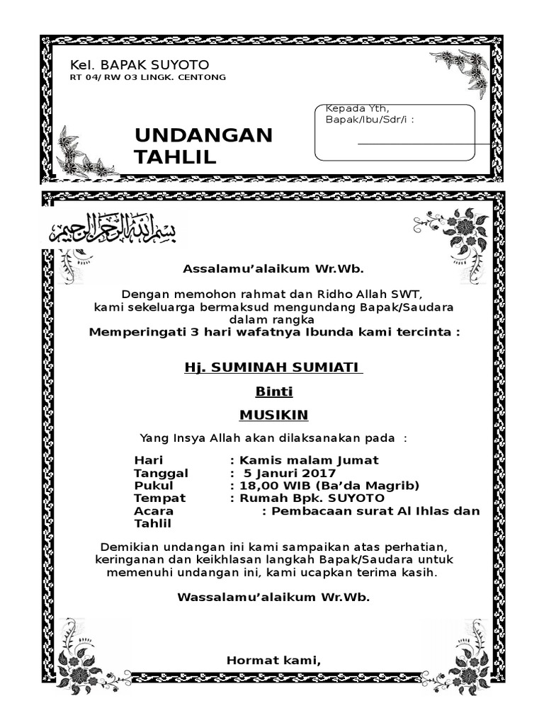 Mohon maaf apabila banyak kesalahan dalam penulisan artikel atau informasi tersebut yang ada kaitannya dengan. Jadi tolong bantu kami dengan mengunggah 1 dokumen baru atau yang ingin kami unduh. Adapun budaya tahlilan yang ada di jawa bukanlah hal wajib untuk di laksanakan oleh umat muslim mengingat rasullallah saw tidak pernah bersabda bahwa setelah. Untuk membuat contoh surat undangan tahlil 40 100 1000 hari haul ini lebih menarik ts udah nambahin border dan sedikit hiasan di sudutnya cek preview nya gan. Tahlilan diadakan sebagai acara untuk memperingati hari kematian seseorang berdoa untuk seseorang dan juga refleksi bagi kita bahwa kita sangat dekat dengan nama kematian. Download contoh surat undangan tahlilan siap edit file doc untuk anda yang tinggal di indonesia khususnya di pulau jawa pastinya tidak asing dengan yang namanya tahlilan.