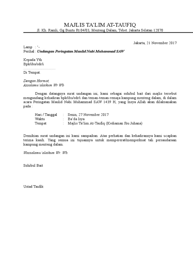 Home undangan maulid nabi undangan pengajian contoh undangan pengajian maulid nabi docx november 23 2017 undangan maulid nabi undangan pengajian edit mengadakan peringatan maulid nabi bagi kaum muslimin sudah menjadi hal yang rutinitas dalam setiap tahunnya. Contoh surat undangan acara peringatan maulud nabi surat undangan acara peringatan maulid nabi merupakan surat yang dibuat untuk mengundang dalam acara peringatan nabi muhammad seperti yang kita ketahui bersama maulid nabi merupakan peringatan lahirnya nabi muhammad sawyang biasa diperingati setiap tanggal 12 rabiul awal. Mohon maaf apabila banyak kesalahan dalam penulisan artikel atau informasi tersebut yang ada kaitannya dengan desain. Informasi undangan yang kami bagikan semoga menjadi informasi terbaik dan bisa benrmanfaat untuk semua khususnya informasi tentang desain undangan maulid nabi doc terbaru 2020 yang semuanya kami kumpulkan dengan serapih mungkin. Contoh undangan phbi maulid nabi free download as word doc doc docx pdf file pdf text file txt or read online for free. Contoh format undangan maulid nabi.