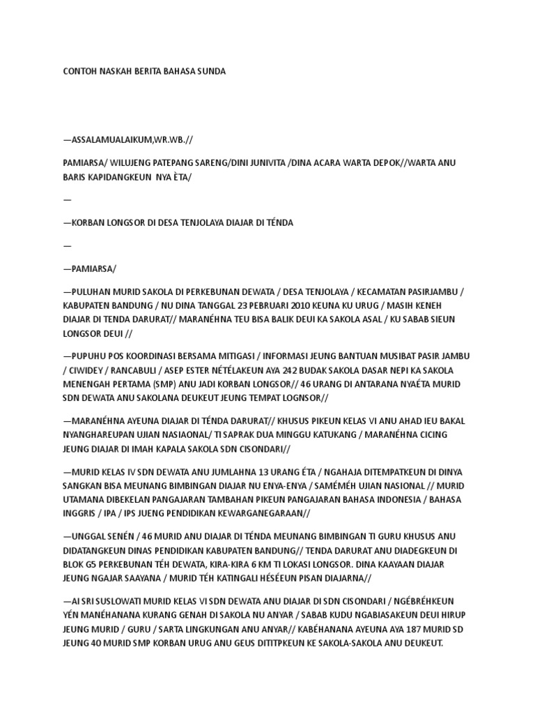 Contoh warta sunda tentang lingkungan. Sungai tercemar warga tuntut ganti rugi. Inilah dia 8 contoh teks berita singkat mengandung unsur 5w 1h di sekitar lingkungan ini lingkungannya yang saya bikin di sekitaran kabupaten bandung saja tidak lebih karena saya orang kab bandung. Nah oleh karena itulah dibawah ini saya sudah siapkan beberapa contoh artikel tentang contoh warta bahasa sunda tersebut yang sebenarnya sudah di update menjadi. Contoh teks berita singkat 5w 1h halooo guysss jadi kali ini merupakan tugas sekolah yaahhh. Heheh maaf ini tugas sekolah yang bisa dibilang sudah lumayang usang heheh tapi gapapa kan. Contoh liputan warsa warta sunda youtube.