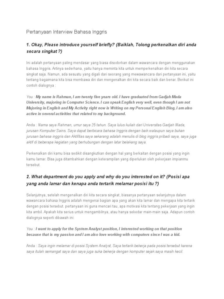 15 pertanyaan interview bahasa inggris plus arti dan contoh jawabannya saat wawancara kerja dengan bahasa inggris pertanyaan interview bahasa inggris pasti akan menjadi momok utama terutama kalau kamu tidak begitu mahir berbahasa inggris. Sebelum memulai alangkah baiknya jika anda mengucapkan salam tersenyum. Kebetulan sekali pada artikel berikut ini admin memberikan sebuah contoh percakapan saat interview atau wawancara kerja. Orang orang dihantui rasa takut akan melakukan kesalahan pada saat wawancara. Walaupun mudah memperkenalkan diri dalam bahasa inggris juga bisa dibilang susah. Sobat pembaca pada posting kali ini saya akan share contoh percakapan interview wawancara kerja dalam bahasa inggrisinterview atau wawancara kerja dalam bahasa inggris biasa didapat jika perusahaan memberi persyaratan pelamar harus bisa berbahasa inggris atau pelamar sendiri yang menerangkan bahwa ia menguasai bahasa bahasa inggris.