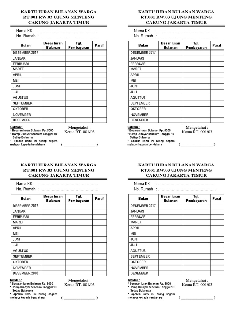 Download contoh kartu iuran bulanan. Bulan tgl iuran ttd rt 25000 jimp 3000 rohni 3000 ptgs pmbyr jan â â. Download contoh kartu slip pembayaran bulanan paud untuk bayar spp paud. Silahkan download inilah contoh format kartu iuran bulanan paud dan tk terbaru tahun ajaran 2016 2017 format microsoft excel tersebut edit terlebih dahulu jika diperlukan. 5000 kk bayar kebersihan sampah rp. Dana keluar rt 009 bulanan bayar keamanan pamswakarsa rp. Kartu prestasi tpa beserta hafalan.